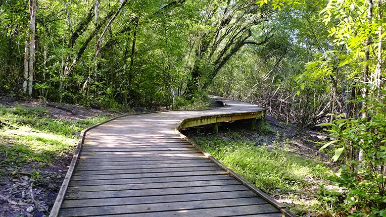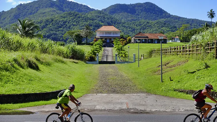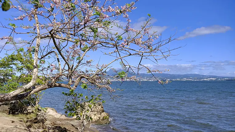 Cross the fence and walk down the central aisle. Continue straight between the amphitheatre and the pontoon. Turn left along the kiosks and follow the path along the mangrove up to the seaside. From there, you have a panoramic view over the bay of Génipa and the towns of the centre. Continue along the seashore. At the fork (dry toilets), go to the left up to the glade and take the track to the left.