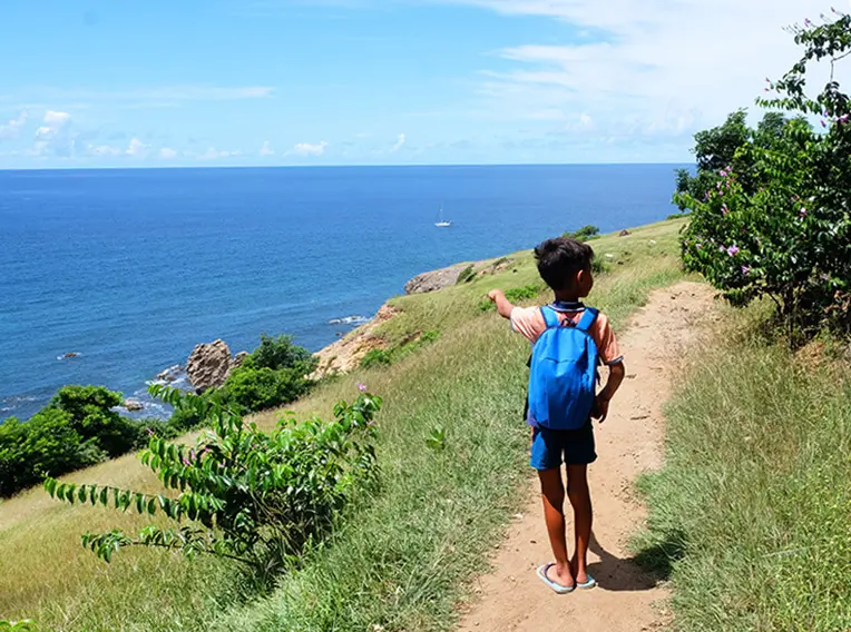 The concrete pavement drops slightly down and you can see a small path that goes to the left. Go on this stony track, in an undergrowth of acacia and hazelleaf croton trees. Do not hesitate to look back to Grande Anse beach and the small village at the foot of the hill.