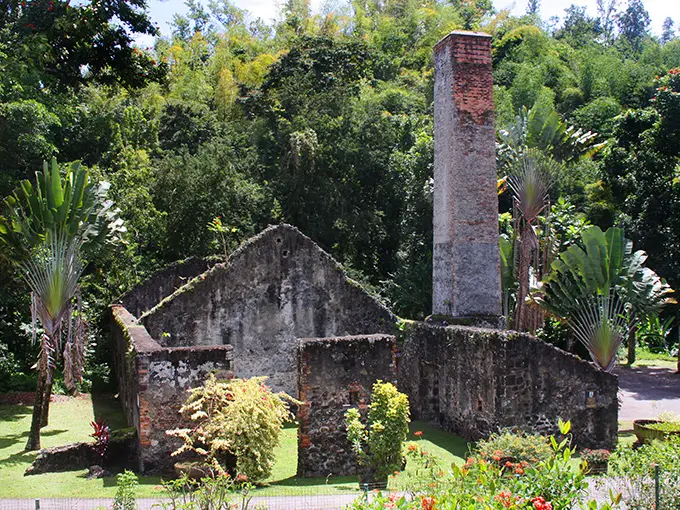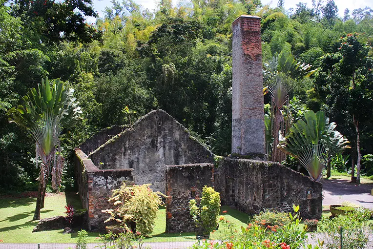 The hike starts next to the ruins of the former sugar factory of La Pagerie. Opposite the entrance to the Musée de la Pagerie, go left on the small road and after the second bridge, take the dirt track (1) on the left which climbs up into a small clearing before going into the undergrowth.