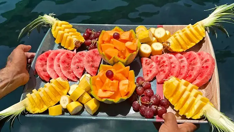 On board, enjoy a Creole break with fresh fruit, traditional accras, homemade planteur and cold drinks.