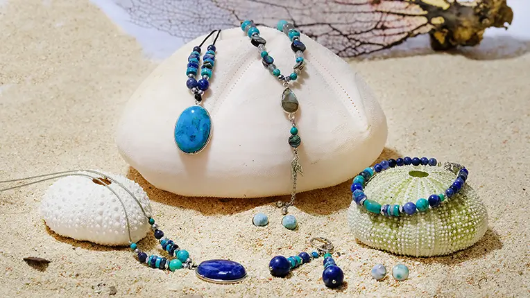 In her boutique-atelier, Martine and her team create unique, personalised jewellery right before your eyes, threading small stones with care and precision to create exceptional bracelets, necklaces, pendants, long necklaces and earrings.