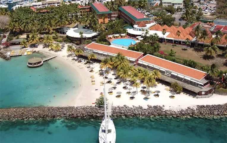 Along a fine sandy beach, caressed by turquoise waters, the 4-star hotel offers a breathtaking view over the sea, on which the Carbet Pitons and the bay of Fort-de-France are visible.