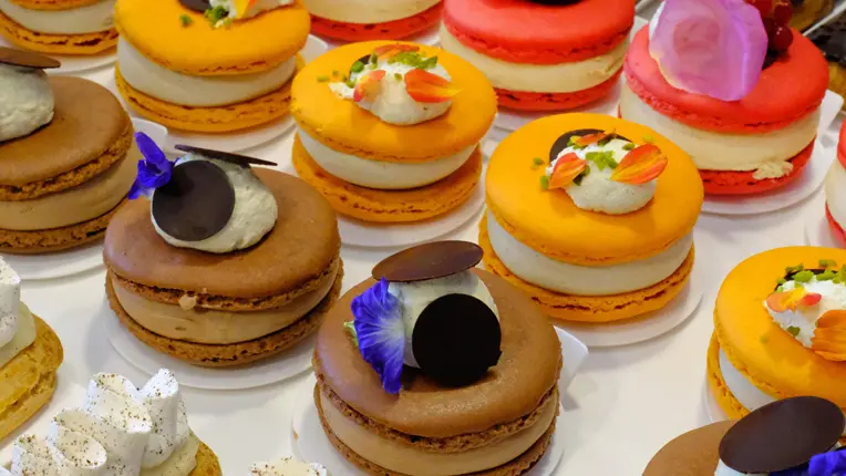 - un macaron à la pistache cœur mangue, ou à la rose cœur fruits rouges et leetchi.