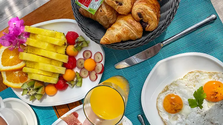 The hotel bar welcomes you in the morning to prepare fresh Martinique fruit cocktails, which you can enjoy by the pool or on the sun loungers overlooking the islets of Le François and La baignoire de Joséphine.