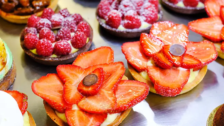 - Fresh fruit tarts, tarte normande, mousses, entremets, individual cakes, éclairs, large cakes.