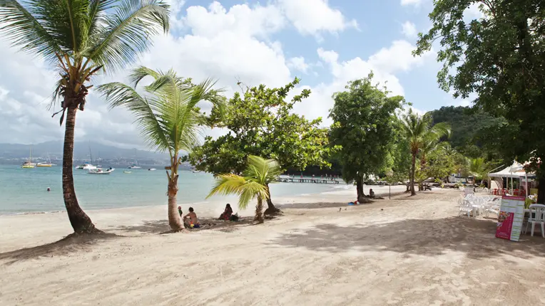 Bordered by palm trees, the beach offers postcard-perfect views over the bay of Fort-de-France, the Pitons du Carbet and the îlet à Ramiers.