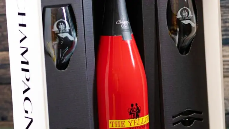 - Offered in gift boxes, including a bottle of your choice (e.g. La Colibri, La Monastique) accompanied by two silk-screened “The Yellow” flutes.