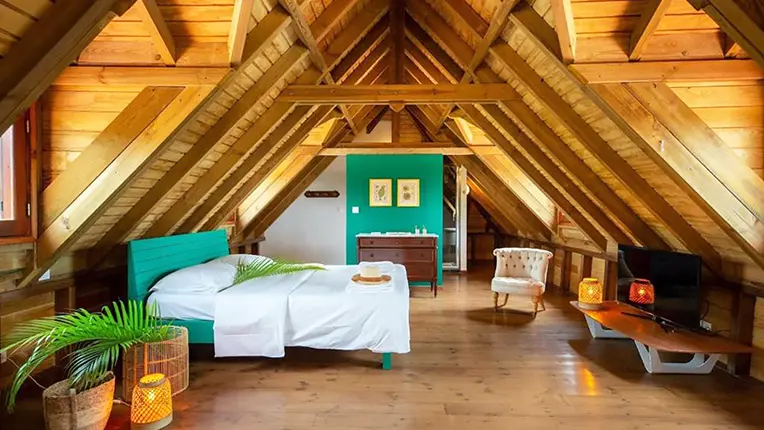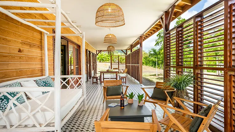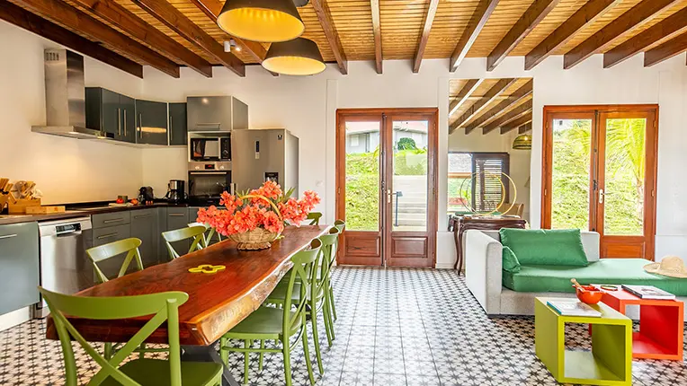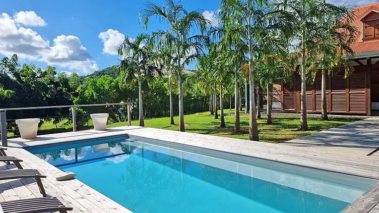 Villa "La Coulée d'Or" offers two different types of accommodation, each of which invites you to enjoy a stay where modernity and tropical charm combine to perfection. Surrounded by a lush organic garden planted with sugar cane and tropical trees, the main Creole villa has a vast ventilated veranda that allows the light and trade winds to penetrate gently. A little further away, the bungalow offers a more intimate stay. Each accommodation has its own swimming pool.